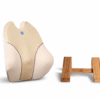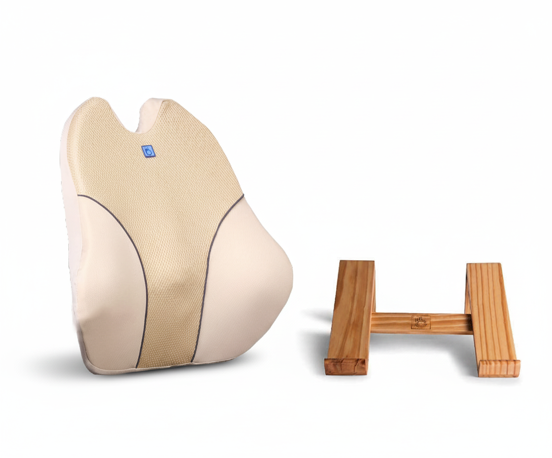 2-in-1 Work Essentials Combo – Includes a Beige Lumbar Support Cushion (Small) and a Pine Wood Finish Laptop Stand.