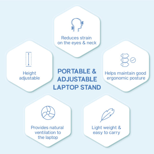 - Adjustable Laptop Stand – Lightweight yet sturdy stand elevates your laptop to eye level to prevent neck and shoulder strain while improving airflow and cooling